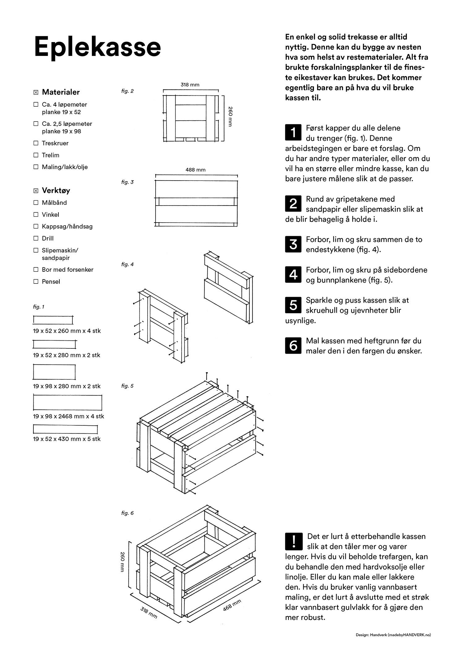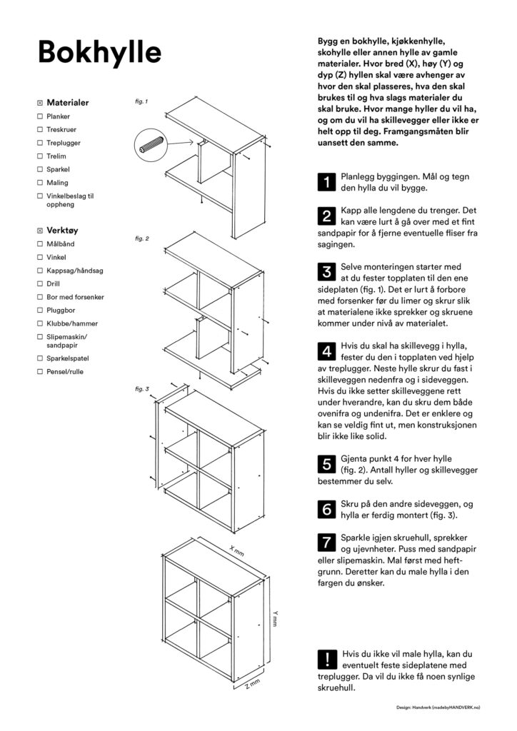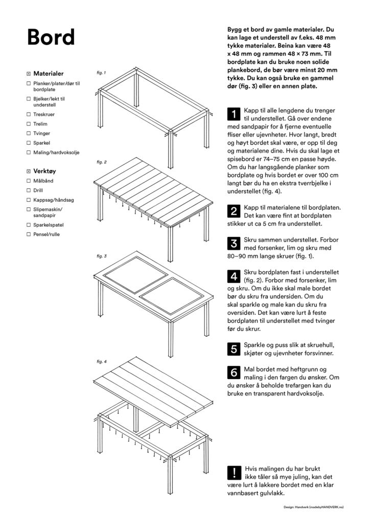 Her finner du enkle arbeidstegninger til både bord, hylle, kasse, krakk og verktøykasse du kan snekre av gjenbrukte materialer. Lykke til!