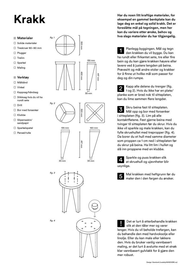 Har du noen kraftige materialer, for eksempel en gammel benkeplate kan du lage deg en enkel og solid krakk. Vi har foreslåtte mål, men her kan du variere etter ønske, behov og hva slags materialer du har tilgjengelig.